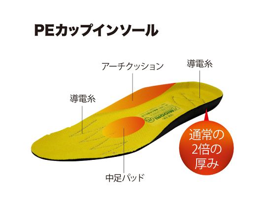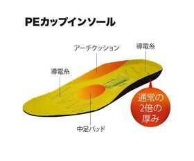 ●PEカップインソール:かかと部は通常の2倍の厚みの優れたクッション性と足に馴染むソフト感。足のアーチの落ち込みを防ぎ疲労を軽減。