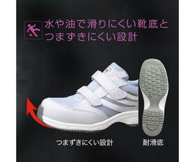 ●油や水でも滑りにくい靴底。安全靴技術指針で定める耐滑性の最高レベル、区分5を実現。また、つま先を高く設計し、つまずきを防止します。