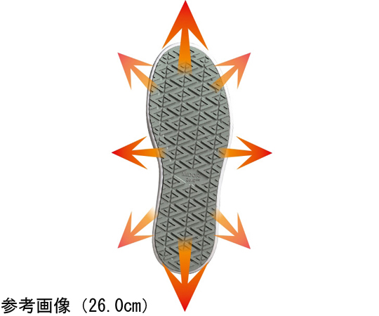 ●ダイヤモンド型の新型意匠により、全方向への耐滑性がUP。さらに、靴底に付着した油なども全方向に逃す意匠で、油切りを速め、安定したグリップ力を発揮します。