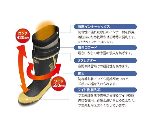 ●落下物からつま先を保護するワイド樹脂先芯搭載。樹脂製のため軽量でJSAA認定A 種の安全性能です。