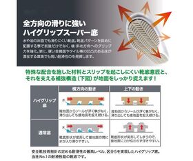 ●水や油の滑りに最高の耐滑性を発揮する新ハイグリップスーパー底。全方向への滑りに強く、グレーチング等の金属面もしっかりとグリップし店頭災害対策に役立ちます。