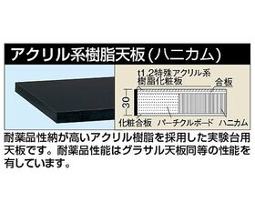●特殊アクリル系樹脂天板を使用したワークテーブルは耐久・耐薬品性能が高く、実験・研究施設に適しています。