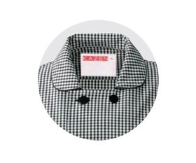 ●パイピングを挟み込んだ丸衿とギンガムチェックが可愛らしさと清潔感をアピール。