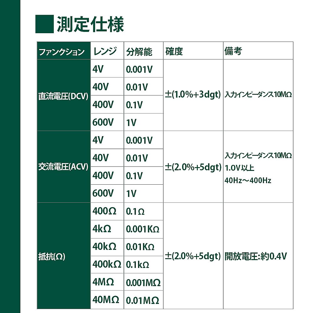●抵抗:400/4k/40k/400k/4M/40MΩ