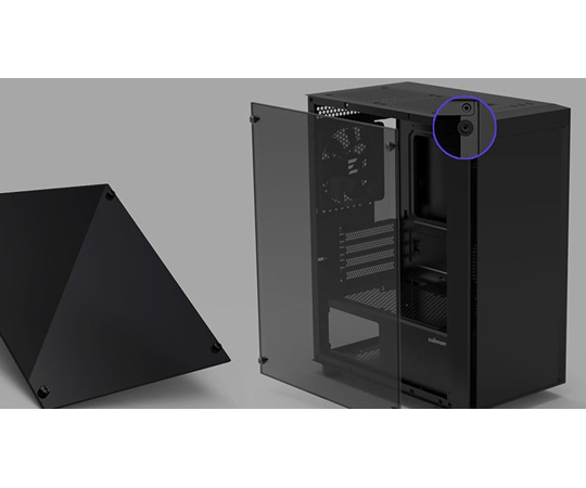 ●▼PC内部がよく見える、全面強化ガラス製のサイドパネルを搭載しています。手回しねじで固定するため、工具なしで簡単に外すことができます。