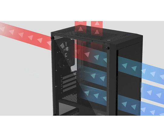 ●▼フロントパネルは側面に縦長のエアインテークを設けています。豊富なエアフローを産み出し、PCケース内の温度を低く保ちます。