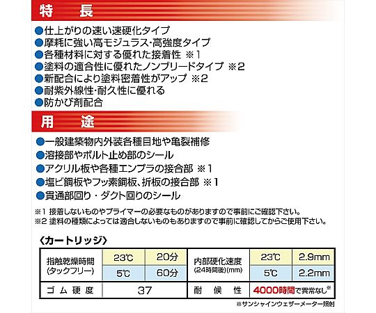 ●低温環境下でも硬化が速い速硬化タイプで、摩耗に強い高モジュラス・高強度シーリング材です。