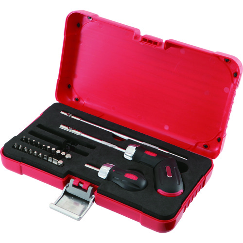 ●ビット差替式で日常作業から本格作業まで様々な用途で使用できます。●送り角8°のラチェット機構です。●グリップのチェンジノブを回すだけで左・右回転と固定の切替が可能です。●作業に応じてグリップをストレート形からピストル形に変更可能です。●グリップ部にビット6個収納可能なマガジン付です。