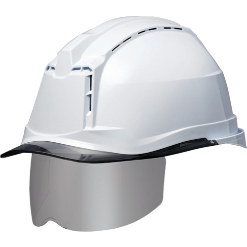 ●シールド面にミラーコーティングを施すことで、可視光線の透過率を50%に軽減し、屋外作業などにおける眩しさによる危険を防止します。●優れた通気性能で、熱中対策に貢献します。(従来品に比べ、約3℃のヘルメット内部温度の低減が可能)●帽体と内装の重量最適化を図り、軽量かつ強度の両立を実現しました。(従来品比-30g)●収納可能な業界最大幅のワイドシールド面で、側面からの飛来物からも眼を守ります。(従来品比+63mm)●安全性・快適性を追求したハイスペックモデルです。●ワンタッチで内装の簡易着脱が可能です。●後頭部から雨水を逃がす、新形状のレインガードが付いています。