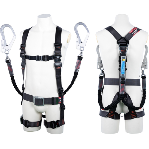 ●胴ベルト部に道具取り付けスペースを幅広く確保したY型のフルハーネスで、多くの工具類を必要とする作業に最適です。●腿部は左右が独立しているので束縛感が少なく、動きやすさを高める水平型腿ベルトです。●ベルトの長さの調節範囲を広く取っているため、夏服・冬服でもピッタリ装着が可能です。●胴ベルトは3点支持なので腰の道具取付スペースが大きく、バランスが良いです。●ベルト素材にナイロンを使用し大変滑らかです。●使わない時には短く縮んでいるので、移動時の引っ掛かりなどを抑えることができます。●ロープが二重構造で、内層のオレンジベルトが見えれば取替のサインとなり、取替時期が明確に分かります。●開口部と握り部がアルミ製の軽量フックを採用しています。●フック連結部が360°回転することにより、ロープのねじれ防止・自由な操作が可能です。●2丁を使用することで絶えず構造物とランヤードが接続された状態を維持し、フック掛け替え時の墜落を阻止します。