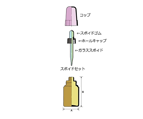 ●本体・角型(ソーダガラス)+スポイドセット(スポイドゴムシリコン白、ホールキャップPPエンジ、ガラススポイド直)+コップエンジUF付