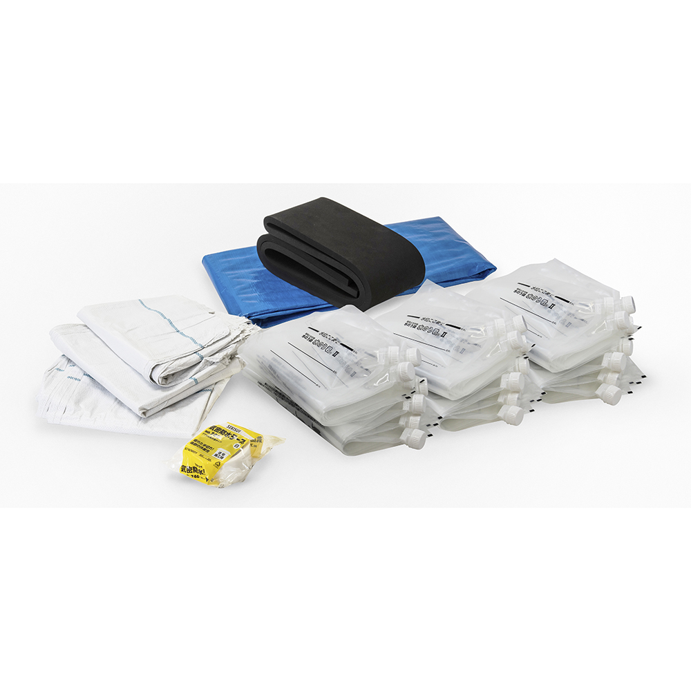 ●セット内容:水のう袋×30枚、防水シート×1枚、土のう袋(20L)×30枚、止水クッション×1枚、防水テープ20m×1巻