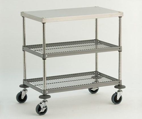 ●材質:棚板上段(板棚)/SUS430 中段(あみ棚)/スチール(パウダーコーティング アースグレー色) 下段(あみ棚)/スチール(パウダーコーティング アースグレー色) テーパー(固定金具)/ABS 柱/SUS430(キャップ/PE・ナット/アルミ)