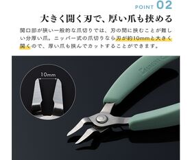 ●約10mmと大きく開くので、厚い爪も挟んでカットすることができます。